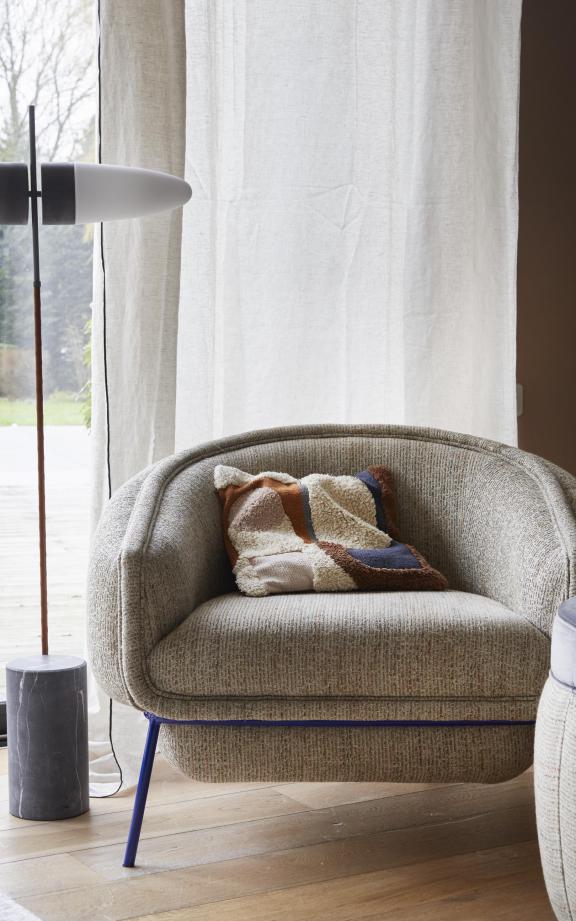 Les chaises de salle à manger aux motifs géométriques et mixés de velours ras sont désignées par Soraya DEFFAR et réalisées sur mesure. Le piétement noyer nous apportera davantage de chaleur et le bois de noyer sera la matière de prédilection qui nous suivra dans la totalité du mobilier et des accessoires. Coté séjour, il en est de même pour le duo : fauteuil de repos et son pouf repose pieds qui lui joue le total look de la matière, c’est le laquage brillant bleu Klein qui viendra apporter subtilité, brillance et encore une fois : Design.